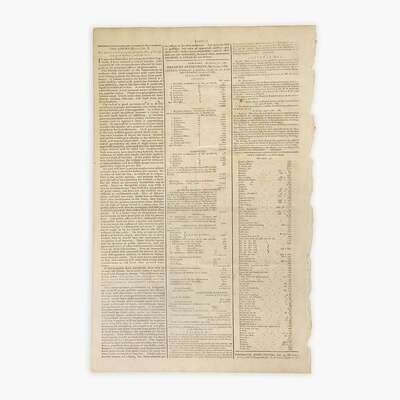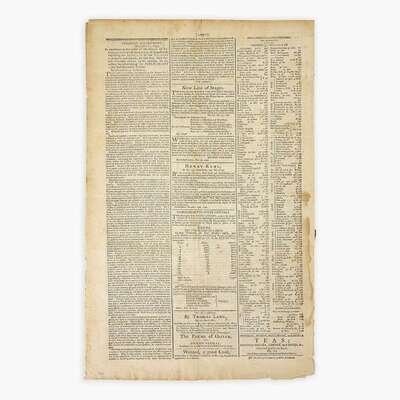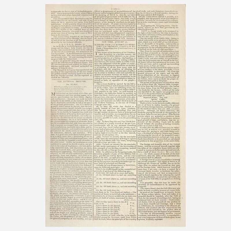 New-York: John Fenno, Wednesday, January 20, 1790. No. LXXXI. Bifolium sheet, 16 1/4 x 10 in. (413 x 254mm). (4) pp. Printed newspaper, in three columns. Features on the second page a "Summary View of the Report of the Secretary of the Treasury, submitted to the Hon. House of Representatives of the United States, on Thursday last," reporting Hamilton's First Report on Public Credit (see lot 10), his seminal treatise on American finance (likely written by him, as he often acted as a ghostwriter for the paper). Creasing from original folds; trimmed along top edge, partial old ownership signature at same; left edge worn and starting; lightly toned.