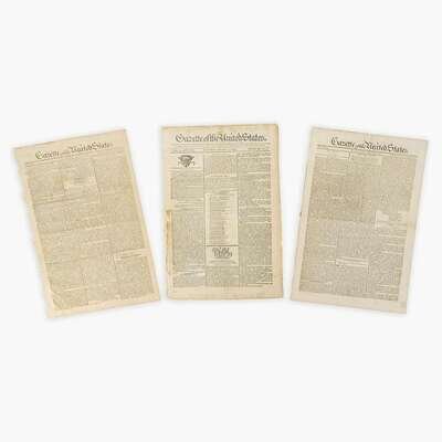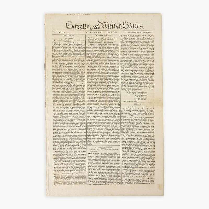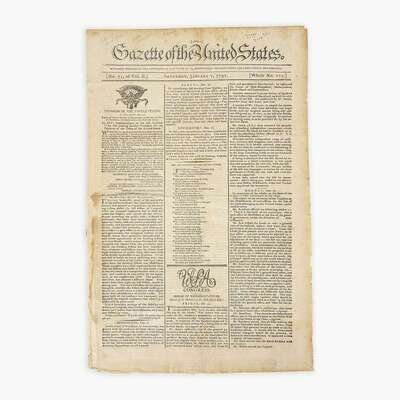 A collection of three issues of this famed Federalist newspaper, reporting important excerpts from Alexander Hamilton's reports on Public Credit (see lot 10), as well as an excerpt from his first report as Secretary of the Treasury (also the first report of the new federal government). According to Ron Chernow, Fenno's newspaper was the Federalist's "quasi-official" paper, with Hamilton originally urging Fenno to establish it, and later raising money to rescue it from financial distress. It was the main Federalist mouthpiece against Jeffersonian newspapers—Philip Freneau's National Gazette and Benjamin Franklin Bache's General Advertiser—during the bitter newspaper wars during President George Washington's administration.