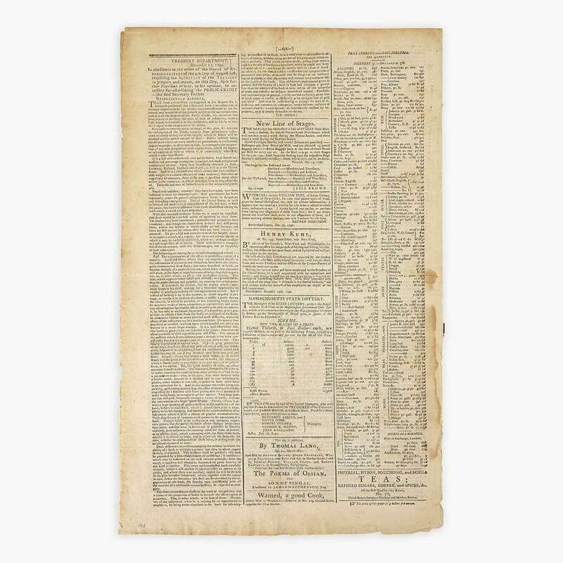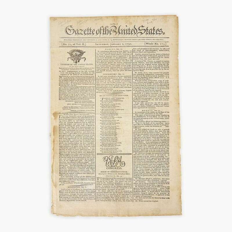 Philadelphia: John Fenno, Saturday, January 1, 1791. No. 71, of Vol. II, Whole No. 175. Bifolium sheet, 16 1/4 x 10 in. (413 x 254mm). (4) pp. Printed newspaper, in three columns. Features on the fourth page an excerpt from Hamilton's second report on public credit, describing his plan for a National Bank—the future First Bank of the United States, and one of his greatest achievements (see lot 14); also included are proceedings from the final session of the first Congress, including debates on the Militia Bill and the public debt. Creasing from original folds; scattered soiling; lightly toned.