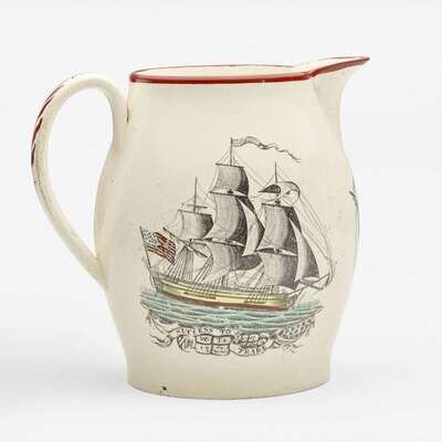 An enamel and transfer-decorated creamware jug Probably Liverpool, England, circa 1800