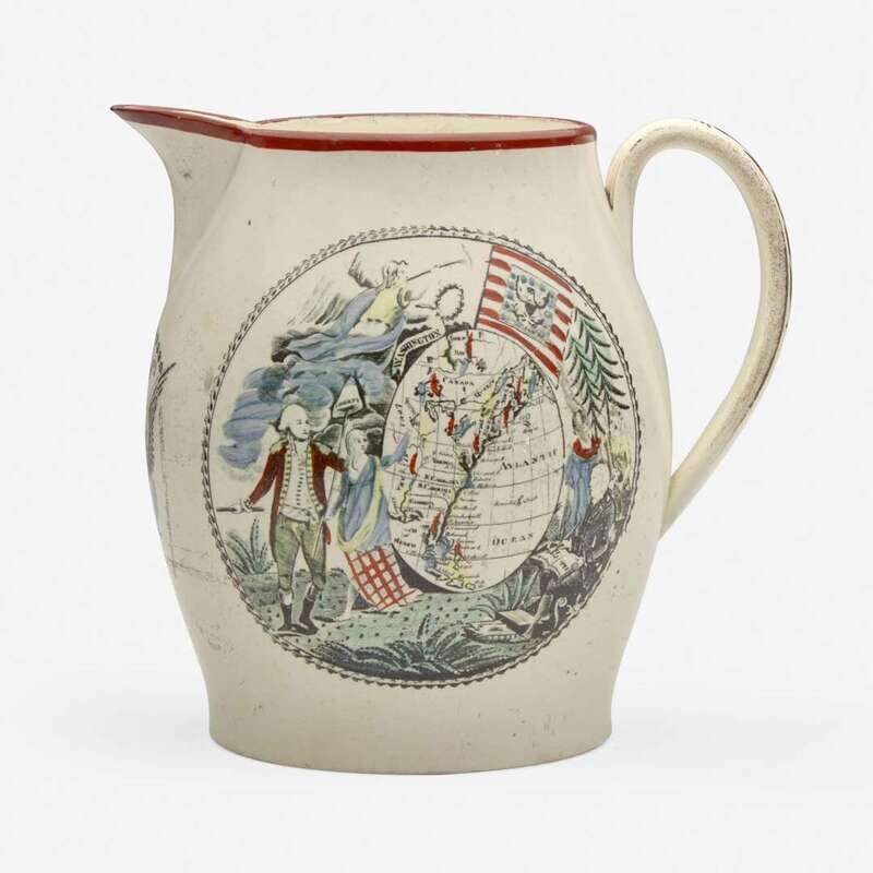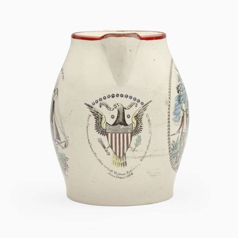 One side bearing American ship with banner below, "Success to Trade"; the other side bearing map of the colonies with George Washington next to Liberty, and Thomas Jefferson writing the Declaration of Independence; with Patriotic eagle and shield below spout; old accession number to underside.