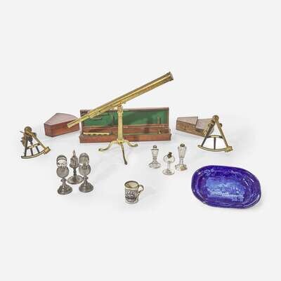 Comprising a Staffordshire Historical Blue platter depicting the Christianburg Danish Settlement on the Gold Coast of Africa, attributed to Wood & Son, impressed mark "Wood" to underside; a transfer-decorated creamware mug with American ship and mariner's compass; six assorted pewter and cut or blown glass whale oil lamps, including a pair with detachable magnifying lenses; a brass telescope by Powell & Lealand, London, with mahogany and brass case; and two English ebony and brass sextants, one labeled "L. Simon/ South.Shields", the other labeled "Perrot's Navigation Warehouse/ Jersey", accompanied by original mahogany and oak cases.