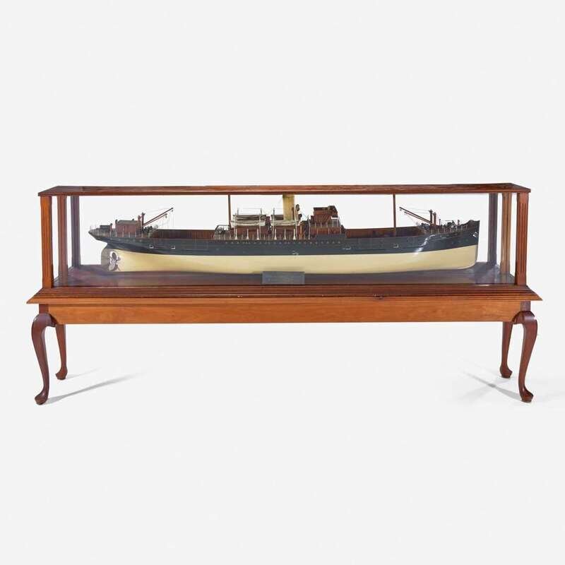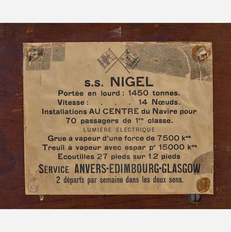Mounted in a mahogany and glass display case with mirrored back, together with later wood stand on cabriole legs, the case back with paper label listing the ship stats in French, metal plaque to front engraved, "S.S. Nigel/ Built By The Grangemouth and Greenock Dockyard/ Grangemouth/ For Messrs George Gibson & Co. Leith/ 1905."