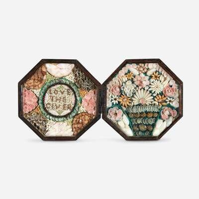 Octagonal form, the left side with round center with inscription, "Love The Giver," the right side with shells arranged as a flower basket, hinged wood case.