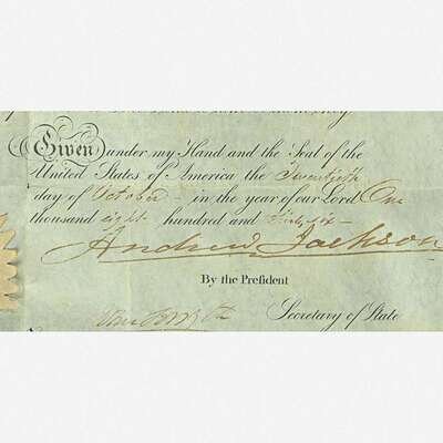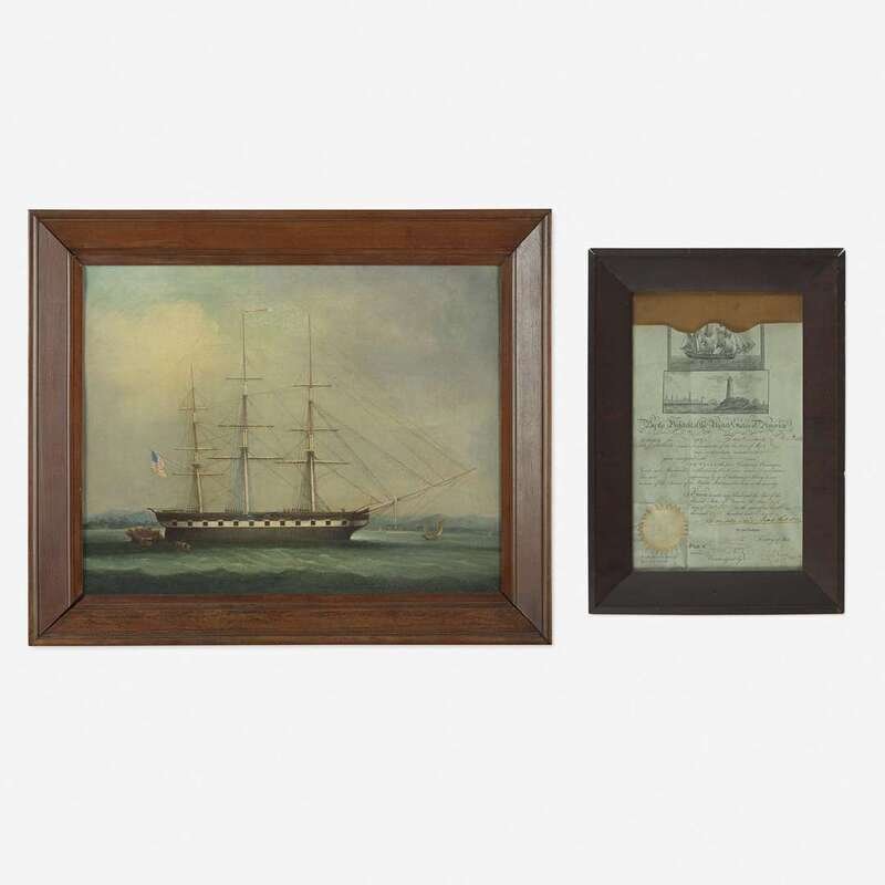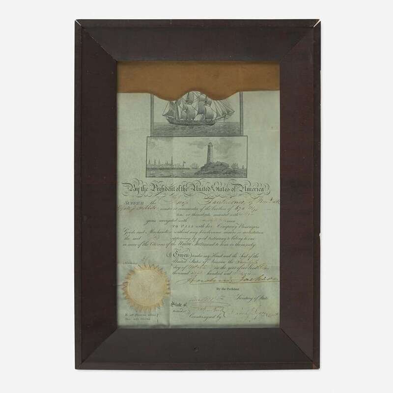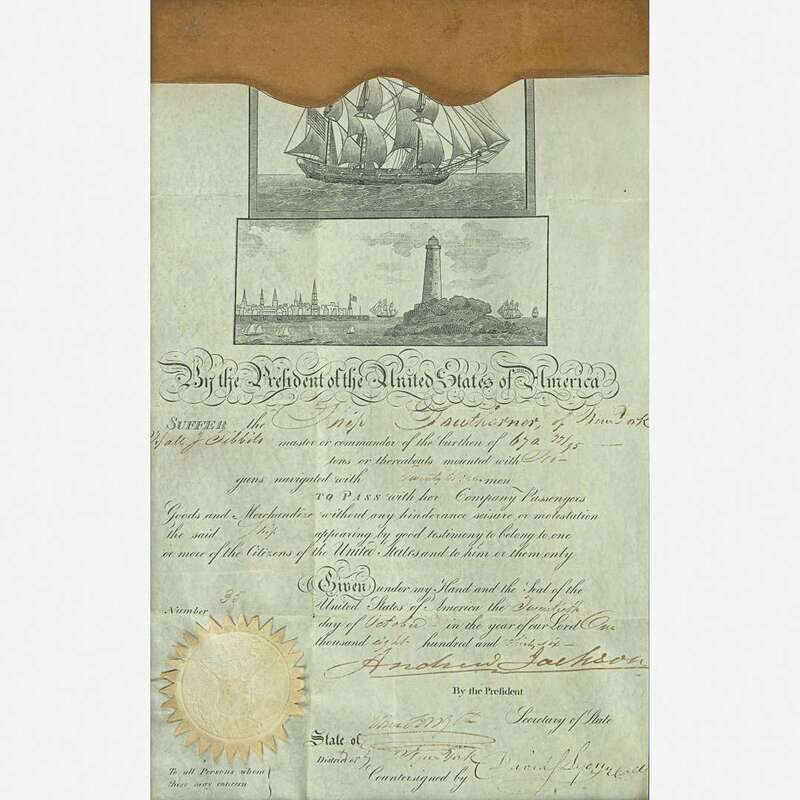 Chinese School 19th century Portrait of the Ship "Southerner", circa 1835, together with Andrew Jackson Signed Ship's Passport