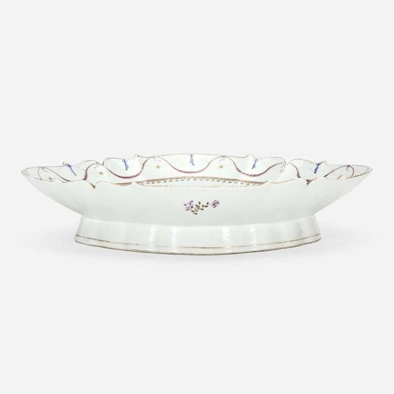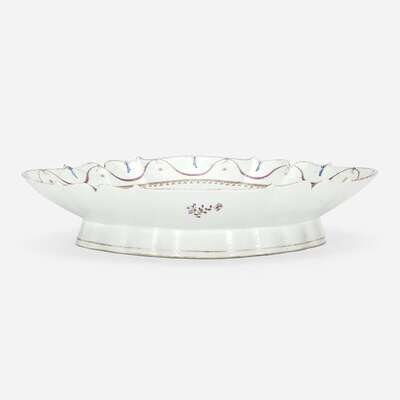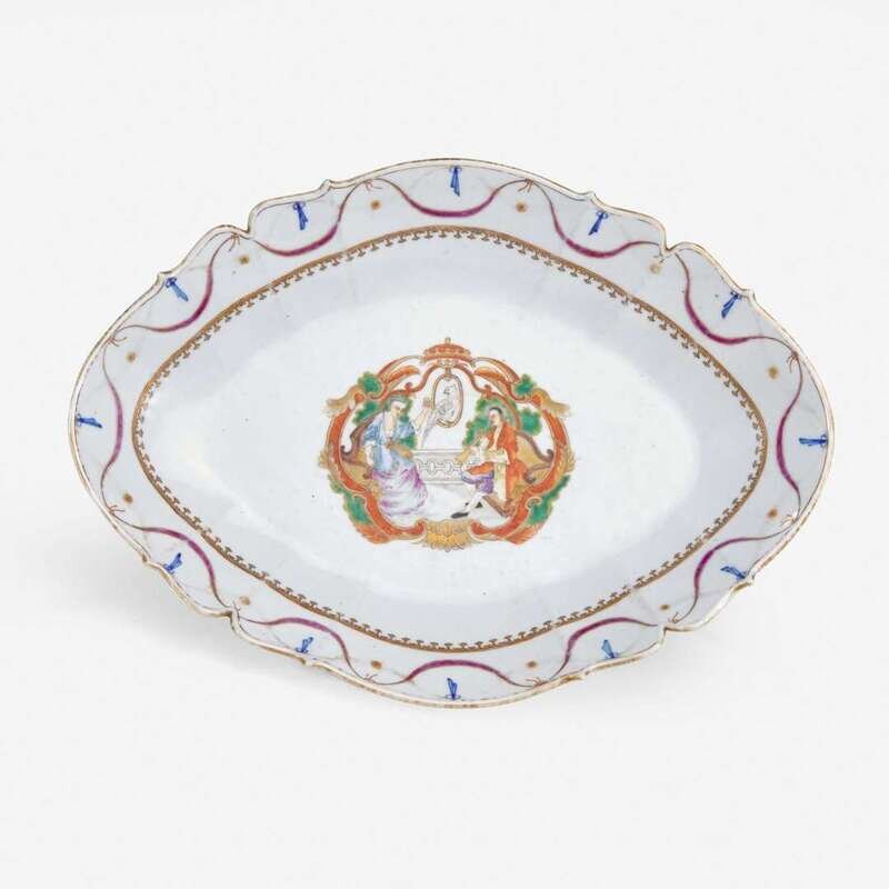 Enamel-decorated, scalloped rim with ribbon motif, the center with two seated figures: a woman feeding a cockatoo and a man playing a flute.