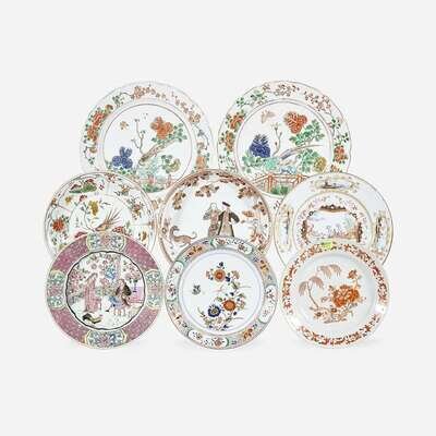 An assorted group of eight Chinese Export porcelain figural and Famille Verte plates/dishes 18th century