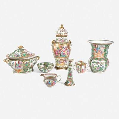 Comprising a covered soup tureen, a covered vase, a flared vase, a bowl, a covered sugar dish, a creamer, and a candlestick.