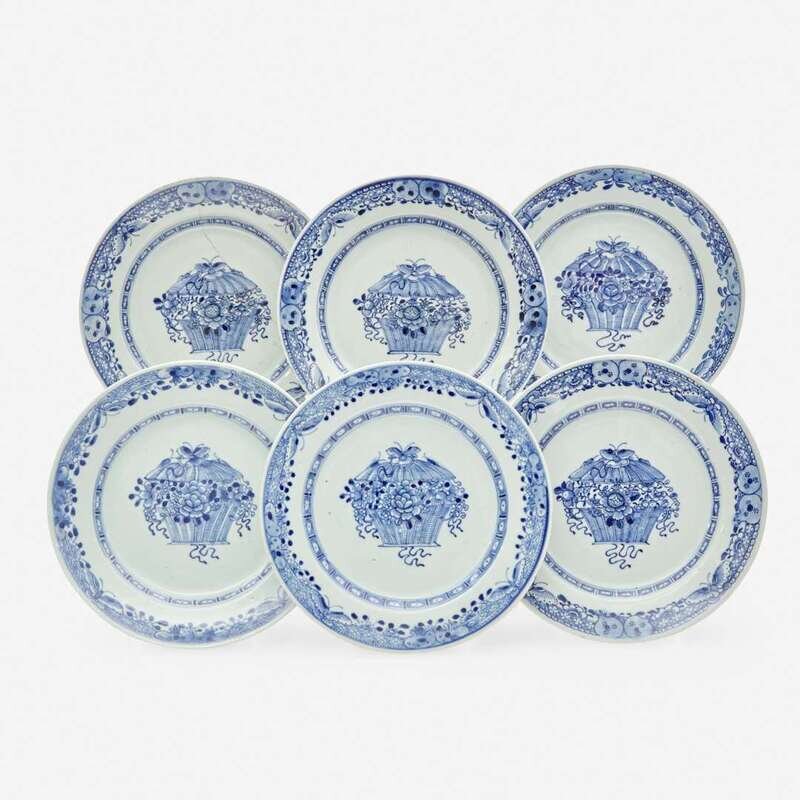 A set of six Chinese Export porcelain blue and white plates with "floral basket" motif late 18th century