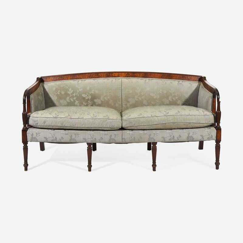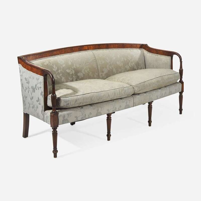 Rounded crest, curved arms with carved leafage, inlaid blocks, reeded legs with tapered feet, blue floral silk upholstery.