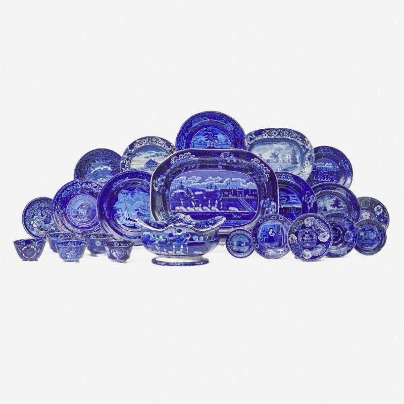 Including a "Landing of Gen, Lafayette at Castle Garden in New York, 16 August 1824" fruit bowl, platter, small plate and soup plate, a "Woodlands near Philadelphia" stand, an "Arms of Rhode Island" plate, a "Nahant Hotel near Boston" plate, two "The Baltimore & Ohio Rail Road" plates inclined and level, "Battery, New York" cup plate, an English view cup plate, a "Cadmus" soup plate, five variously patterned tea bowls and saucers and a small plate with romantic landscape. (23)