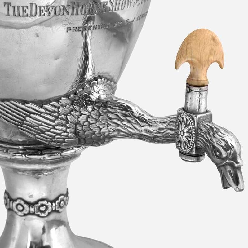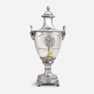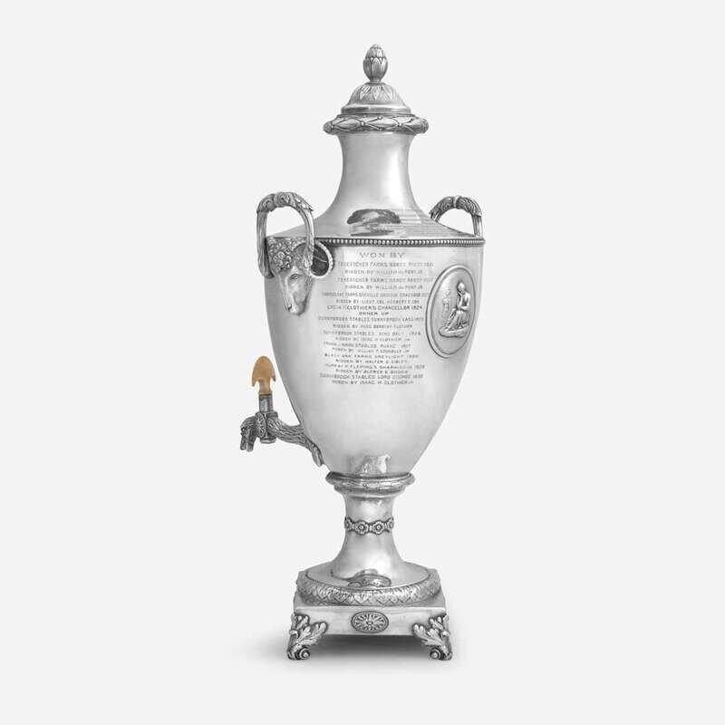 Of Classical urn form, beaded rim and registers with anthemion and laurel motifs, with ram-form handles, swan-form spout, and acorn finial, the body with oval repoussé roundels depicting Neoclassical figures: an oracle to front and mourner near Greek armor to back, the base on floriate feet; later engraved, "Corinthian Challenge Trophy/ The Devon Horse Show and Country Fair Inc./ Presented by E.J. Lehman/ To Be Won Three Times By the Same Owner For Permanent Possession./ To Be Awarded One Year to the Winner Over the Corinthian Course in the Ring, Which Shall Include a Thirty Foot In And Out-- 4 Ft. In and 4 Ft. 6 In. Out./ The Course Shall Also Include a White Board Fence Not Over 4 Ft. 3, And Brush Jumps./ To Be Ridden by Amateur Members of Recognized Hunt Clubs, in Colors./ Conformation 25 Per Cent; Performance 75 Per Cent.," marked to underside.
