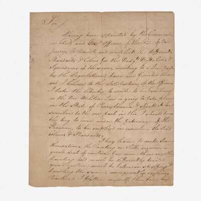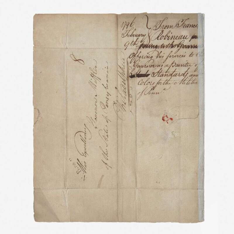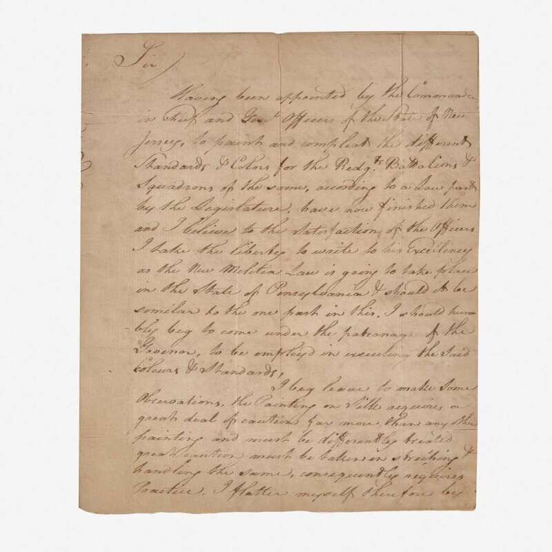 In the letter to "To his Excellency Governor Mifflin of the State of Pennsylvania Philadelphia" Robineau offers his services as a painter of Standards and Colors to the Militia of Pennsylvania writing: "Having been appointed by the in Chief and Genl Officers of the State of New Jersey, to paint and complete the different Standards & Colors for the Redg.s Battalions & Squadrons of the same, according to a Law past (sic) by the Legislature, have how finished them and I believe to the Satisfaction of the Officers. I take the liberty to write to his Excellency as the New Militia Law is going to take place in the State of Pennsylvania & should it be similar to the one past in this. I should humbly beg to come under the patronage of the Governor, to his employd in executing the Said Colours & Standards.
