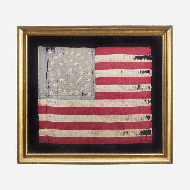 The stars embroidered in a double wreath enclosing "4" on a silk canton, machine-sewn silk stripes and header sleeve, mounted and framed.