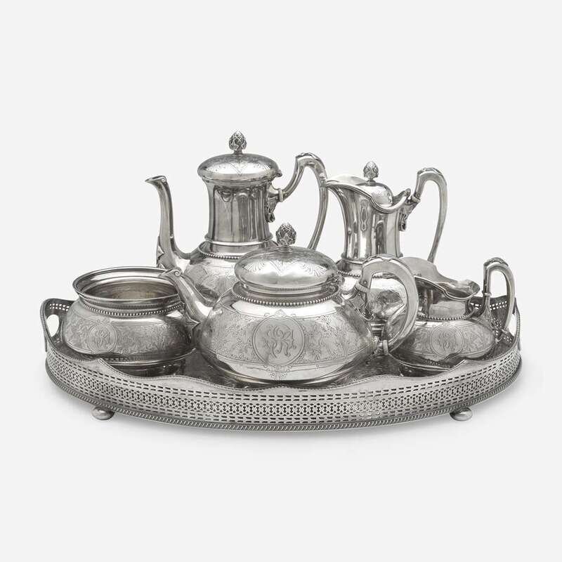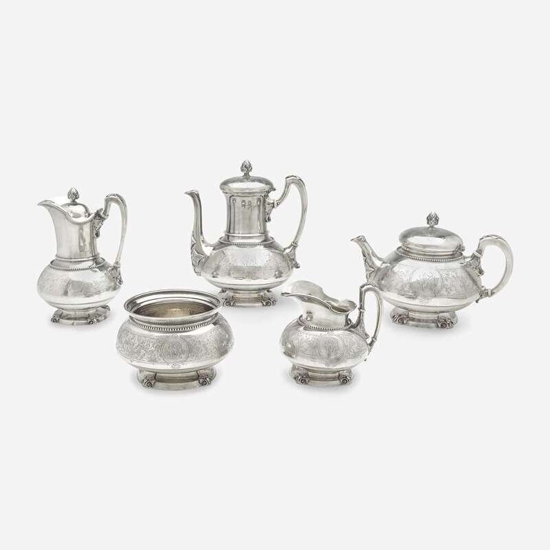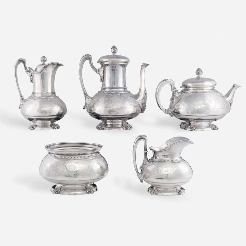 A five-piece sterling silver tea and coffee service in the "Ivy" pattern John Chandler Moore (c. 1803-1874) for Tiffany & Co., New York, NY, 1854-1870