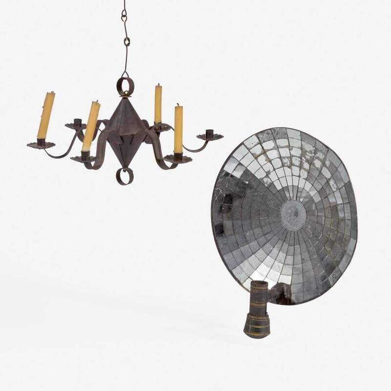 A miniature tinware chandelier and mirrored tin candle sconce 19th century