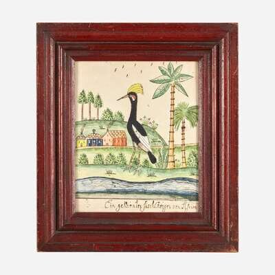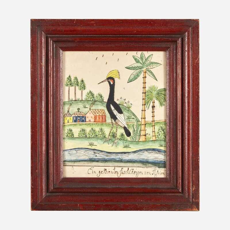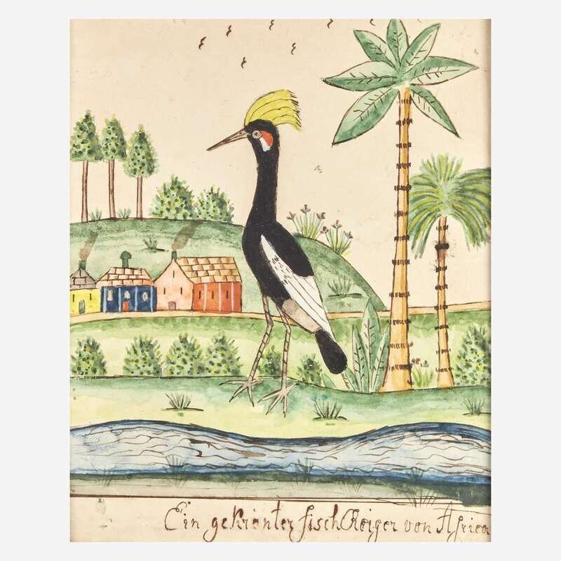 Attributed to the Exotic Scenery Artist A Schwenkfelder Fraktur: The Crane from Africa, circa 1820