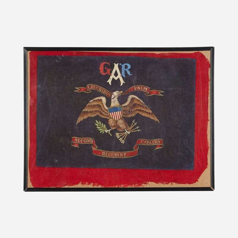 Hand-painted in polychrome on silk, "GAR" above emblazoned American Eagle with bannerette inscribed, "E. Puribus Unum" with another bannerette inscribed, "Second Regiment Cavalry" below, mounted to silk fabric.
