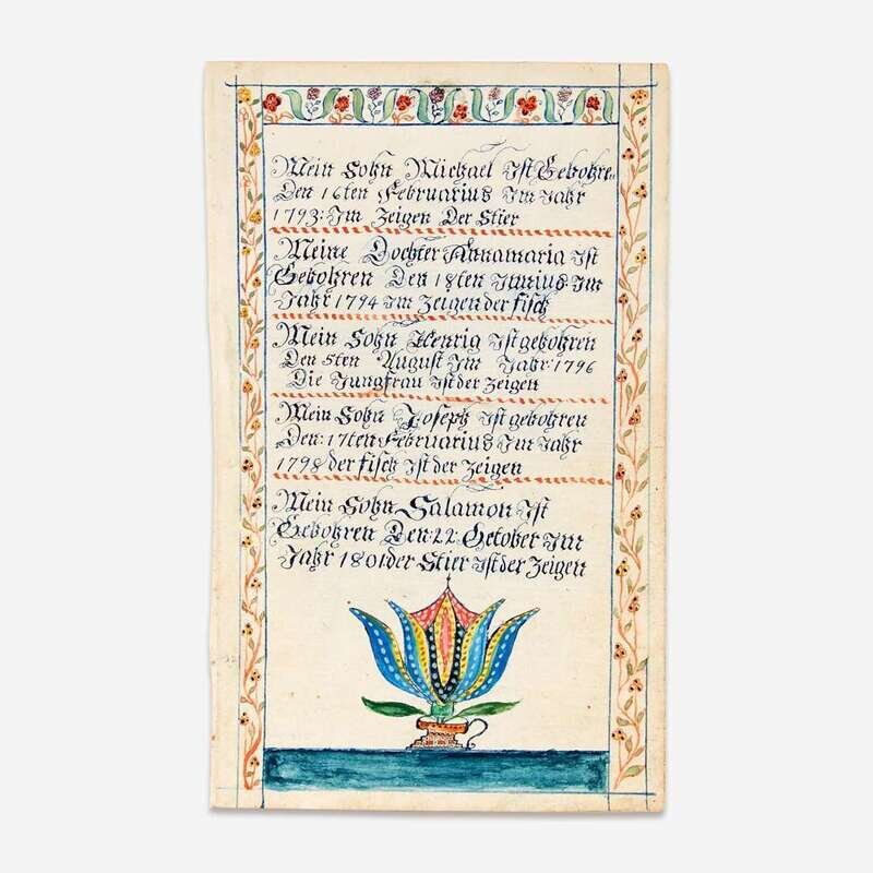 American School 19th century Fraktur: Kauffman Family Register, Lancaster and Perry Counties, PA, early 19th century