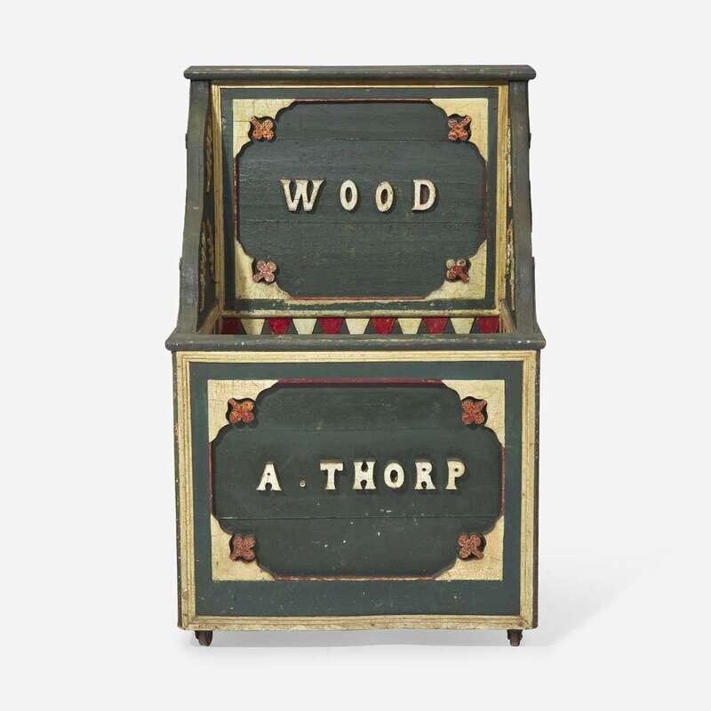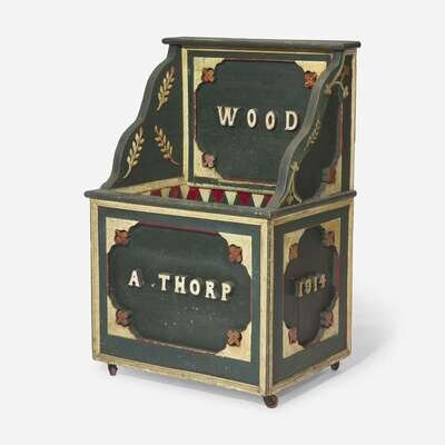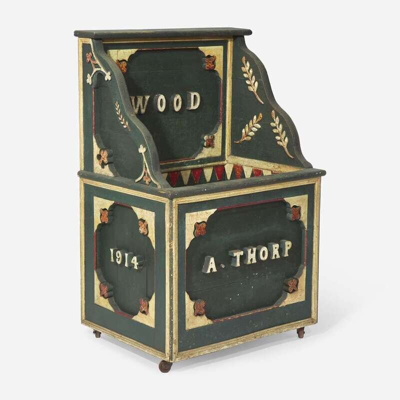 With cut and applied letters reading, "1914", "A. Thorp," and "Wood," and cut-work quadrants and leaf devices, on casters.