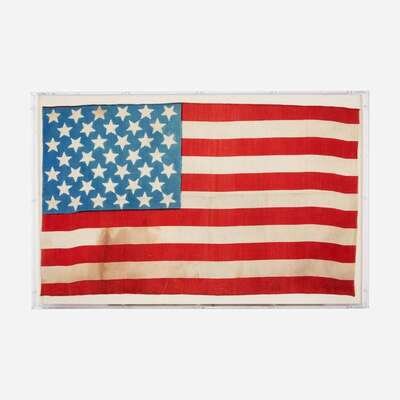 Printed on cotton, the stars in tight straight 'akimbo' rows of 6-5-6-5-6-5-6, the canton resting on red stripe, 11 stripes, machine-sewn edges mounted and framed in plexiglass.