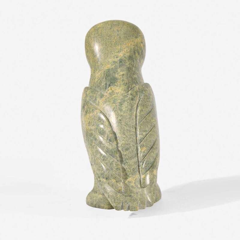 Carved serpentine or green soapstone, incised maker's mark to underside of foot, with paper gallery labels.