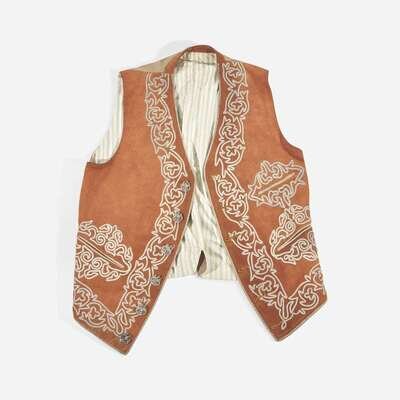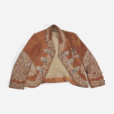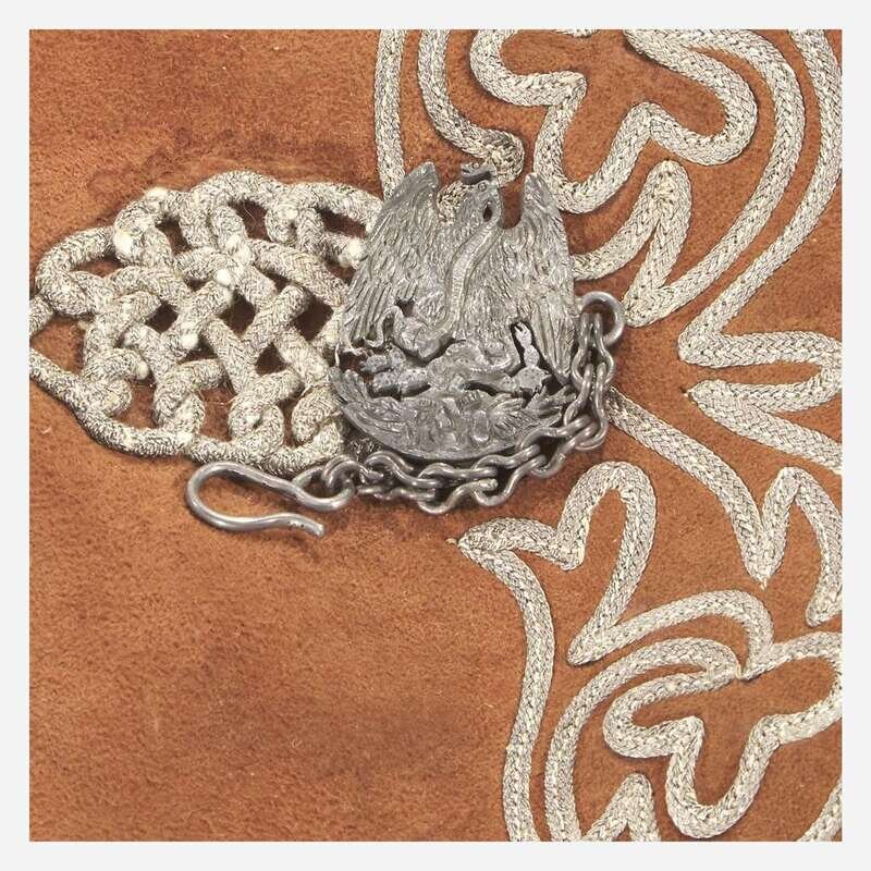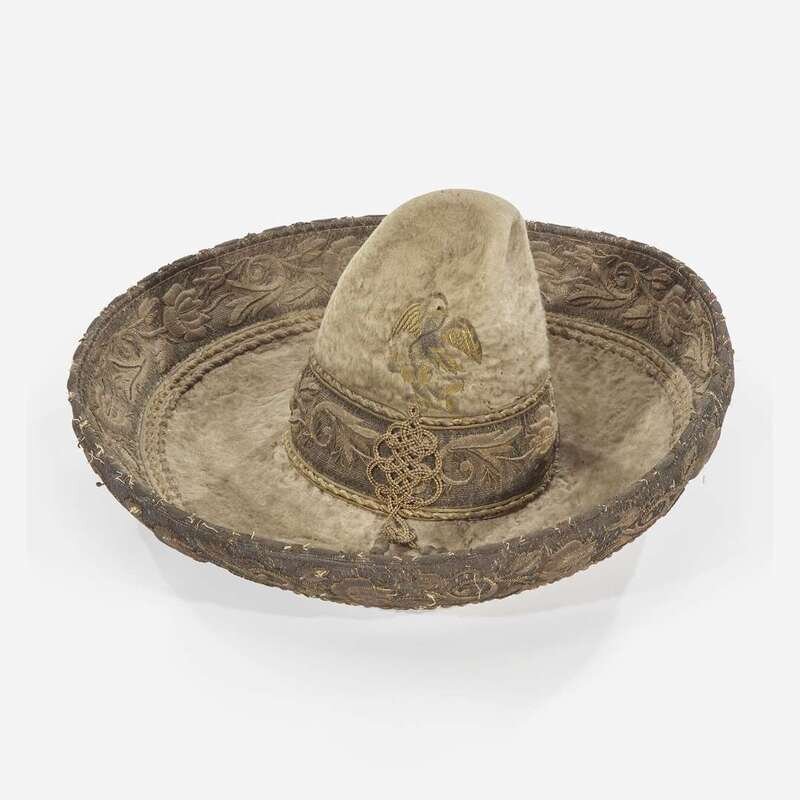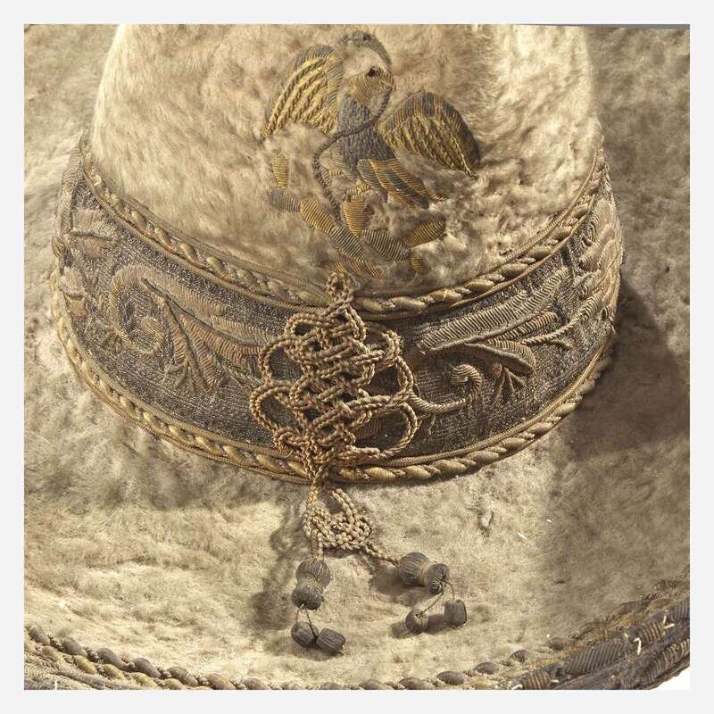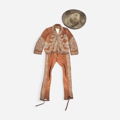 Comprising embroidered suede pants, waist coat, and jacket, with silver 5 centivos coin buttons, dates ranging from 1890s-early 1900s, and Mexican eagle clasps; and a late 19th-century metallic-thread embroidered beaver fur sombrero, the top with Mexican eagle, snake, and cactus, the rim with floral motifs.