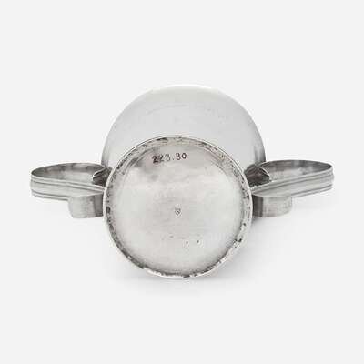 The body engraved with inscription, "Ex dono Wm Browne senr, Esque.," with somewhat later strap handles, marked to body and underside.