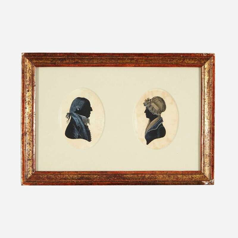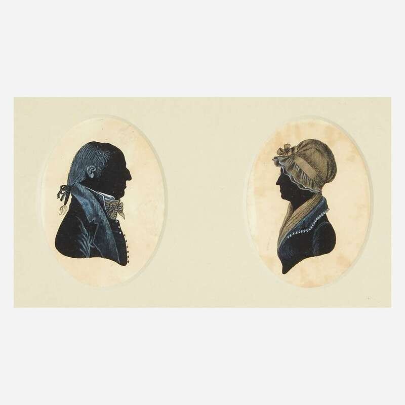 With fan-carved drawers to upper and lower case, original hardware, accompanied by pair of silhouettes of Hannah Robbins (1750-1827) and Martin Kellogg (1746-1828) of Newington, Connecticut.