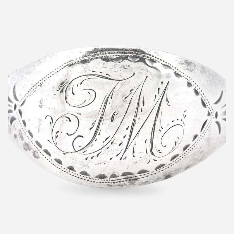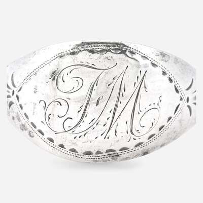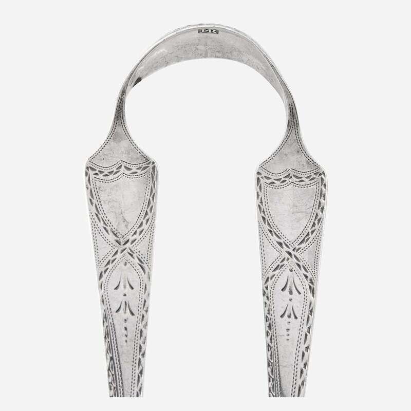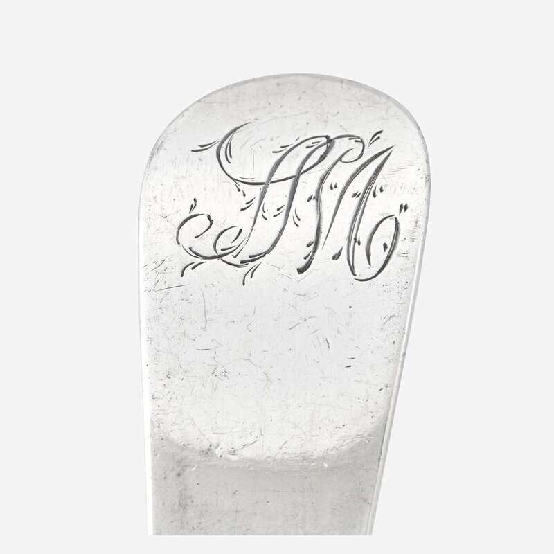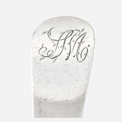 The ladle by Joseph Richardson, Sr., with shell-form bowl, handle end engraved with monogram "TM," marked twice to stem back; the sugar tongs by Joseph Richardson, Jr., with bright-cut decoration, the end engraved with monogram "TM" in cartouche, marked to inside of end.