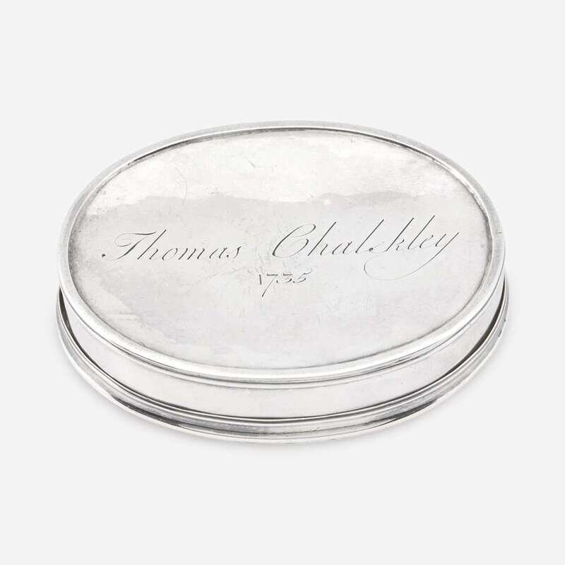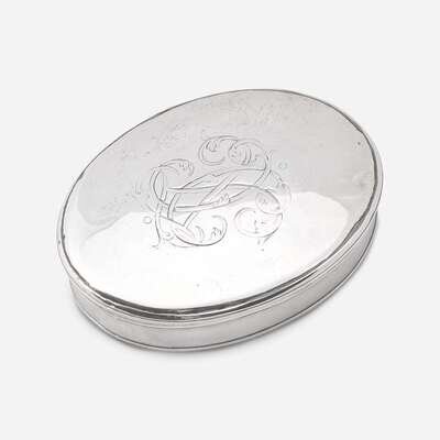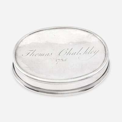 Oval form with molded edges, engraved with mirrored monogram cipher "TC" to lid, engraved "Thomas Chalkley 1735" to underside, marked to interior bottom.