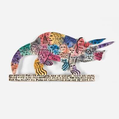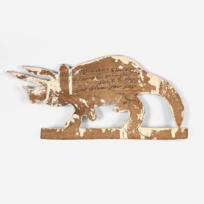 Signed bottom left, signed again, dated 'July 3, 1988' and inscribed '7000.951 works since 1976/ God Bless You All' verso, oil on shaped panel.