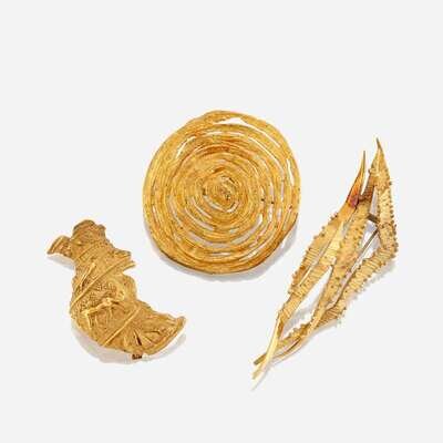 one designed as a fragment of ancient pottery; one designed as a highly textured swirl; the last an abstract design in textured and polished gold.