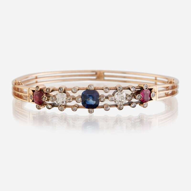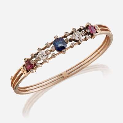 An antique fourteen karat rose gold, diamond, sapphire, and ruby bangle