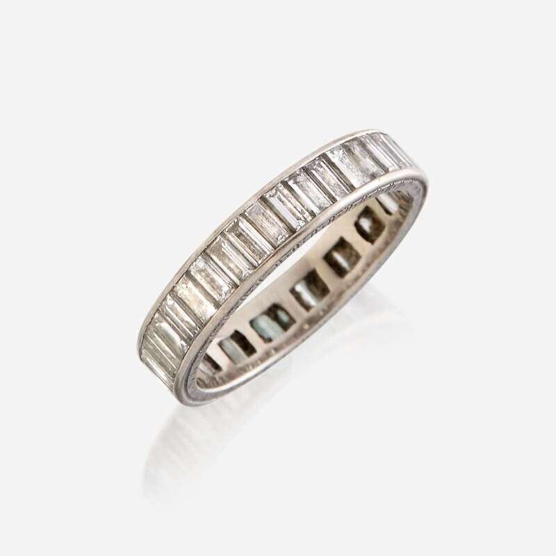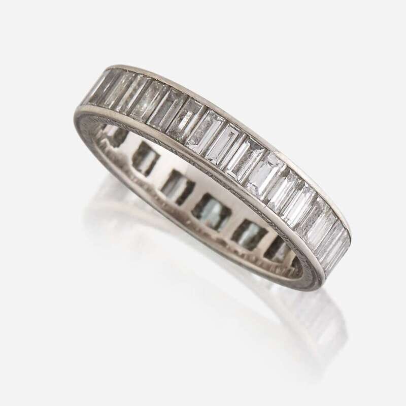 comprised of straight baguette-cut diamonds; estimated total diamond weight: 2.25 carats, with etched edges.