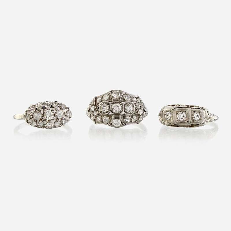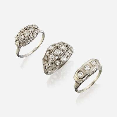 including one set with old mine-cut diamonds in millegrained and etched platinum mount, estimated total diamond weight: 1.45 carats; one set with circular-cut diamonds mounted in fourteen karat white gold, estimated total diamond weight: 0.80 carat; and one set to the top with three old European-cut diamonds, mounted in pierced fourteen karat white gold, estimated total diamond weight: 0.35 carat.