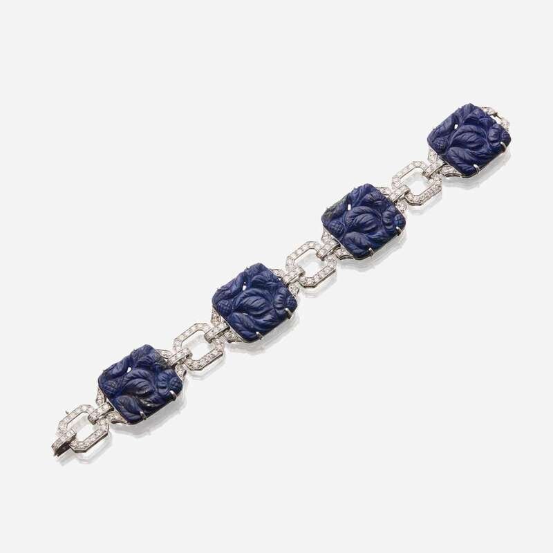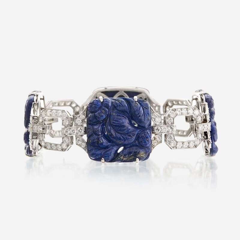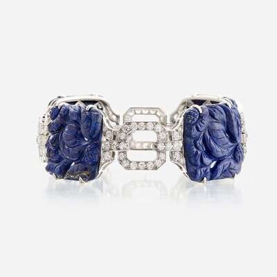 designed as carved lapis lazuli square tablets measuring approximately 22.20mm in diameter, alternating with open square links set with old European-cut diamonds; estimated total diamond weight: 3.50 carats.