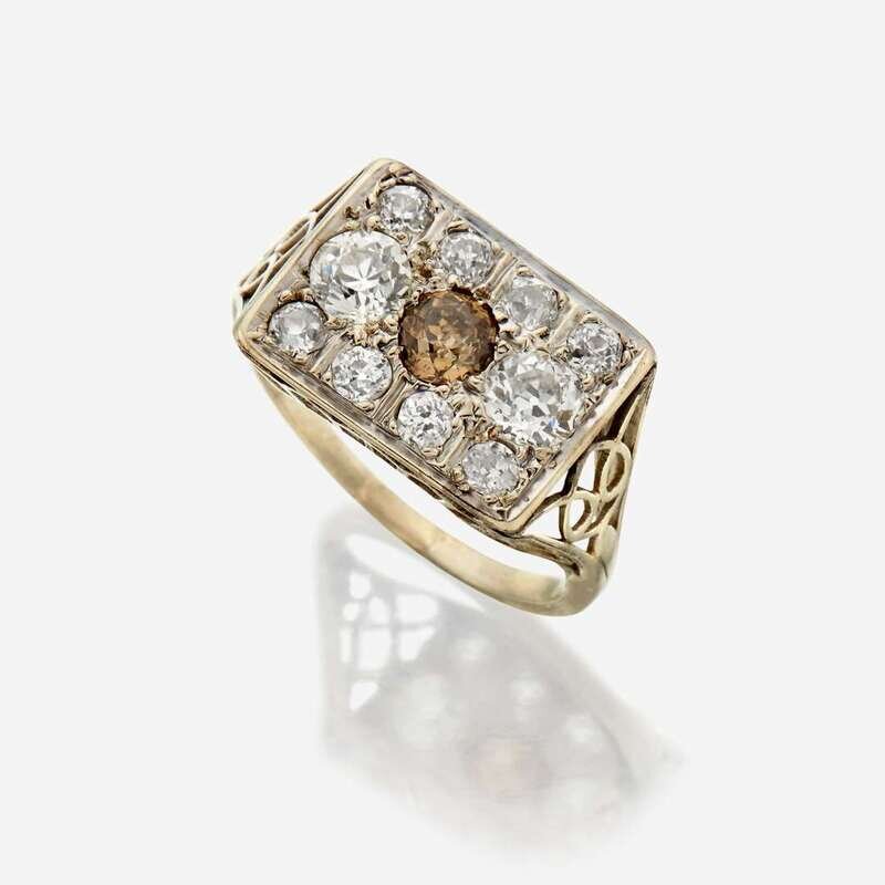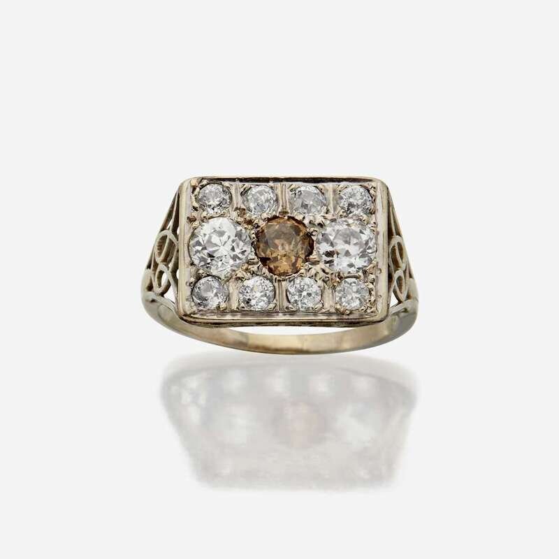 rectangular shaped center by an old mine-cut brown diamond (not tested for origin or nature of color), surrounded by old mine-cut diamonds; estimated total diamond weight: 1.75 carats, within a pierced fourteen karat white gold mounting.