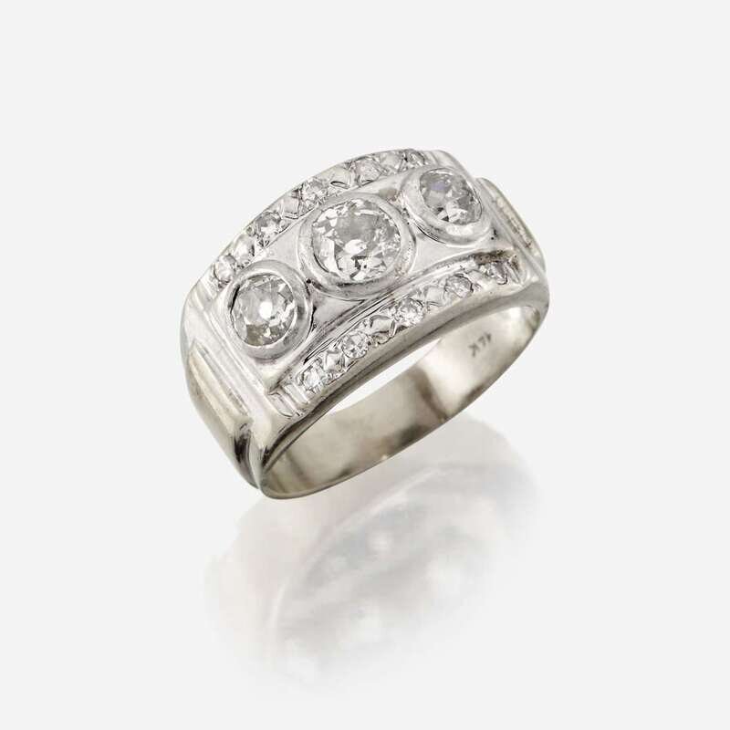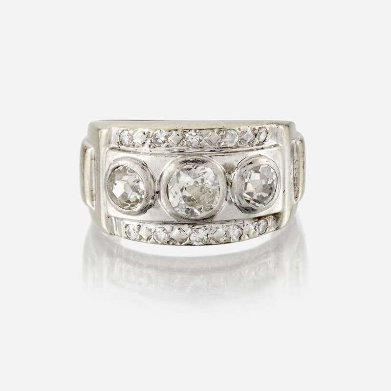 centering three old mine-cut diamonds weighing approximately 0.40, 0.30, and 0.30 carat each, accented by single-cut diamonds, mounted in rhodium plated fourteen karat gold.