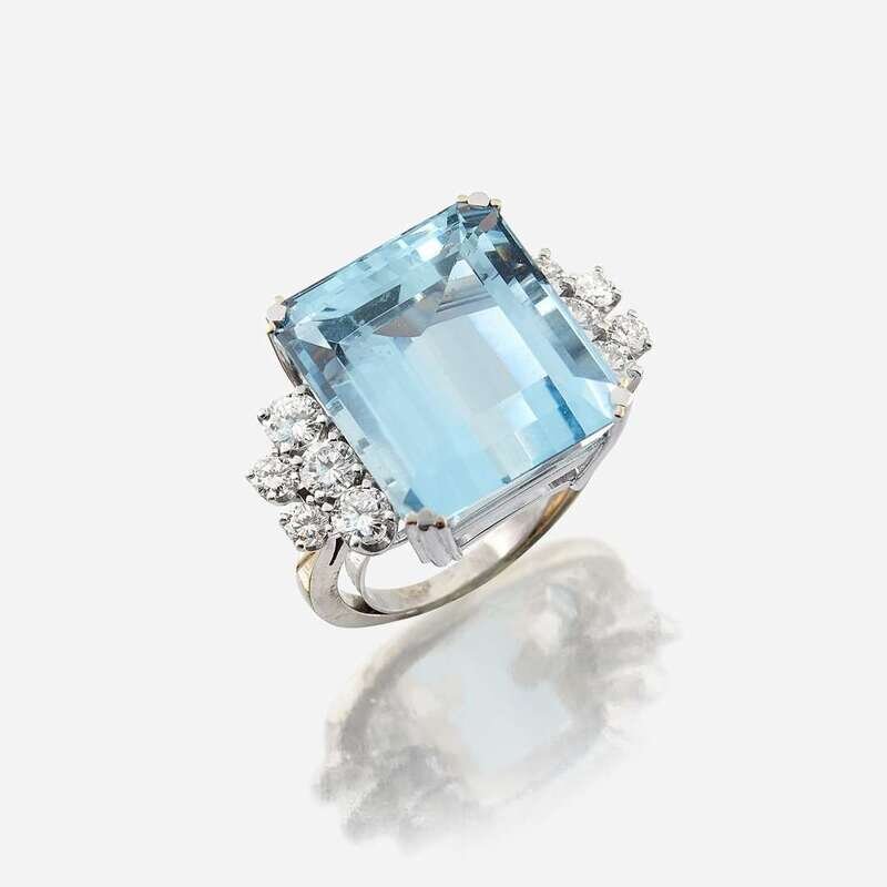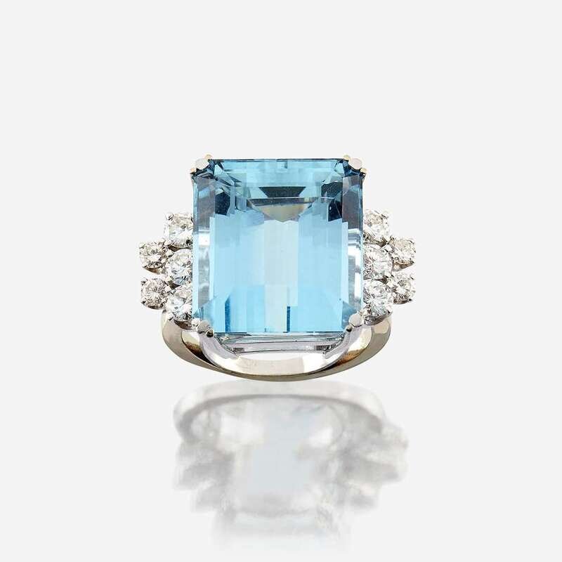 centering a rectangular-cut aquamarine weighing approximately 19.00 carats, flanked by round brilliant-cut diamonds; estimated total diamond weight: 1.50 carats.