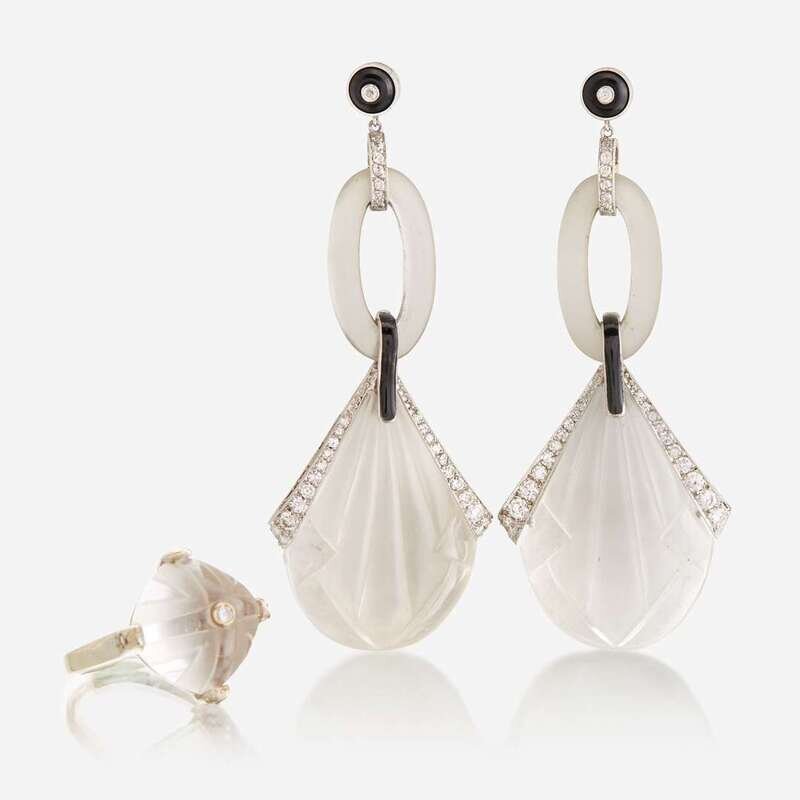 the geometrically carved rock crystal drop earrings accented by diamond-set millegrained platinum bars and black enamel; the sugarloaf carved rock crystal ring accented by single-cut diamonds.