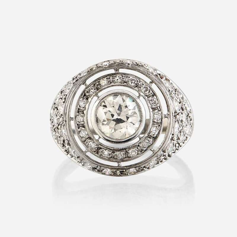 centering a bezel-set old European-cut diamond weighing 1.01 carat, surrounded and flanked by single-cut diamonds; estimated total remaining diamond weight: 0.65 carat, in pierced and millegrained mount.