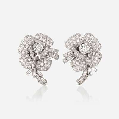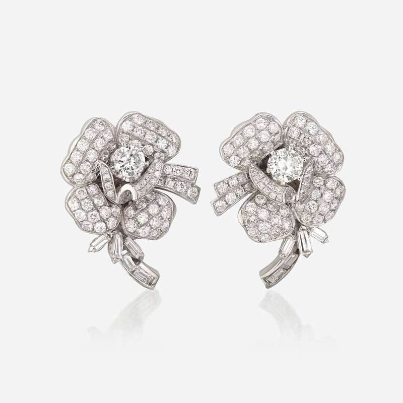 designed as flowers, each centering a round brilliant-cut diamond weighing approximately 0.55 carat, accented by numerous round brilliant and baguette-cut diamonds; estimated total remaining diamond weight: 3.50 carats.