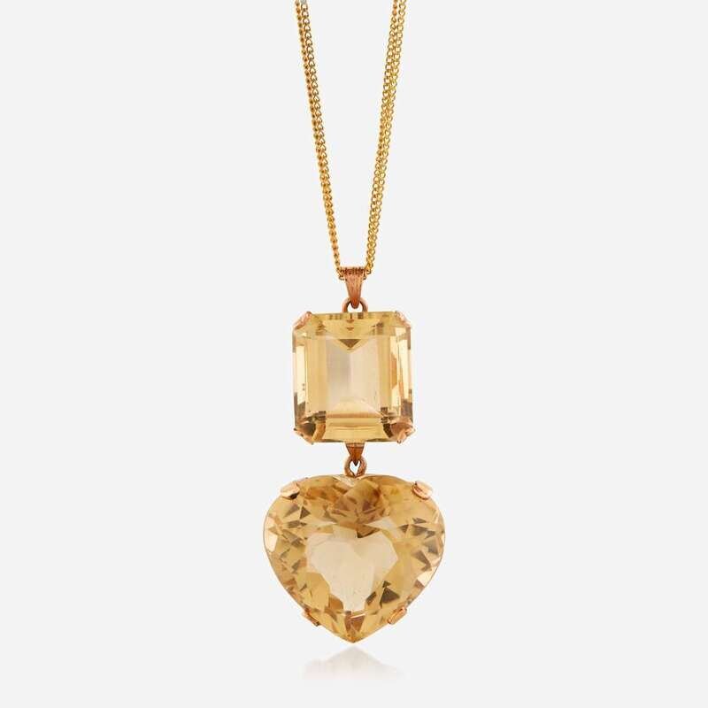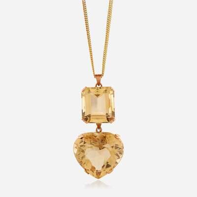 the pendant suspending a heart-shaped citrine weighing approximately 41.00 carats from an emerald-cut citrine weighing approximately 20.00 carats.