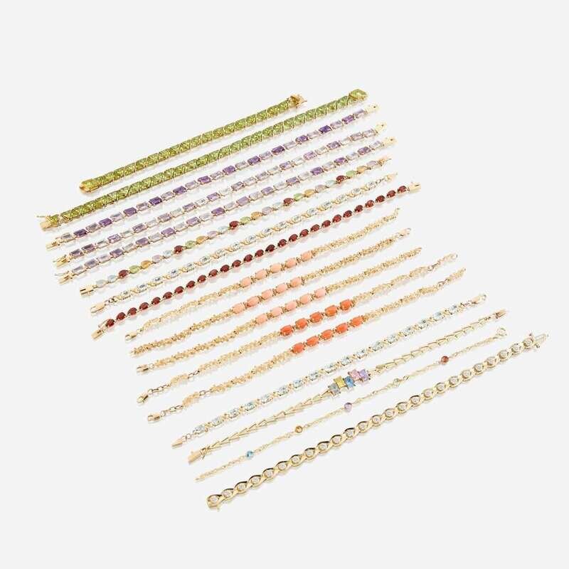 A collection of seventeen fourteen karat gold and gem-set bracelets