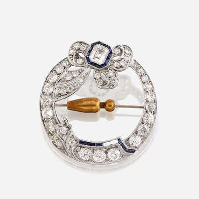 designed as an open circle with a bow, set with an emerald-cut diamond weighing approximately 0.50 carats, accented by old mine-cut diamonds and channel-set sapphires; estimated total remaining diamond weight: 3.00 carats.