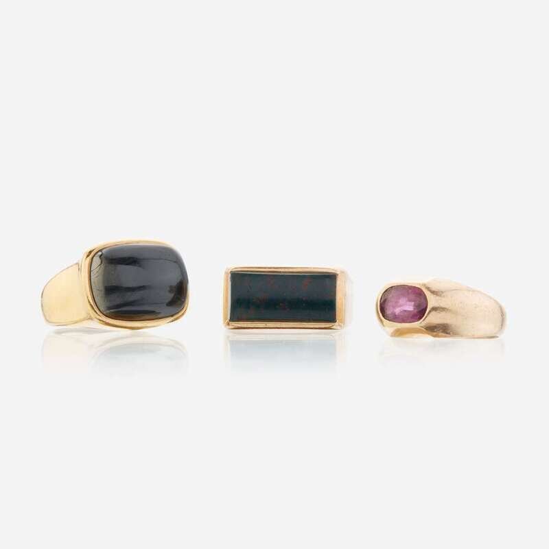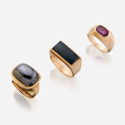 including and eighteen karat gold ring centering a cabochon hematite measuring approximately 17.70 x 12.90 x 7.20mm, signed Boregaard; a fourteen karat gold ring centering a bezel-set oval-cut ruby weighing approximately 1.75 carats; and a fourteen karat gold ring set with a bloodstone tablet measuring approximately 18.00 x 8.10 x 3.70mm.