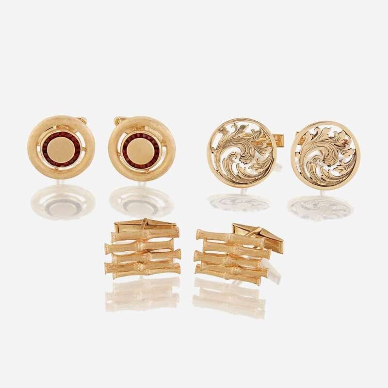 A collection of three fourteen karat gold cufflinks