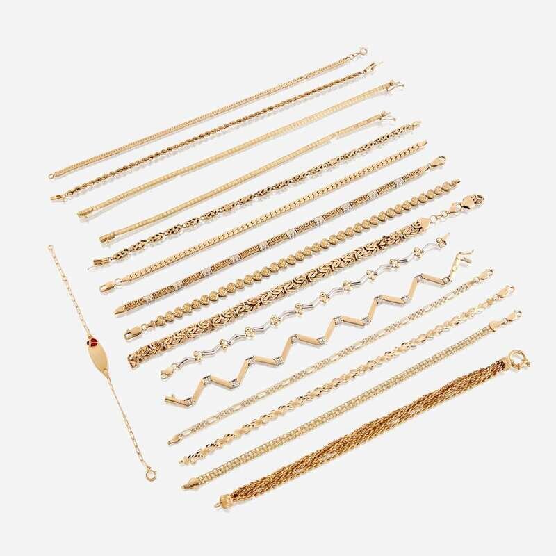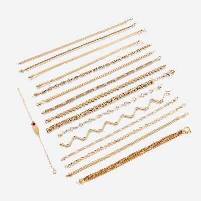 A collection of sixteen fourteen karat gold bracelets