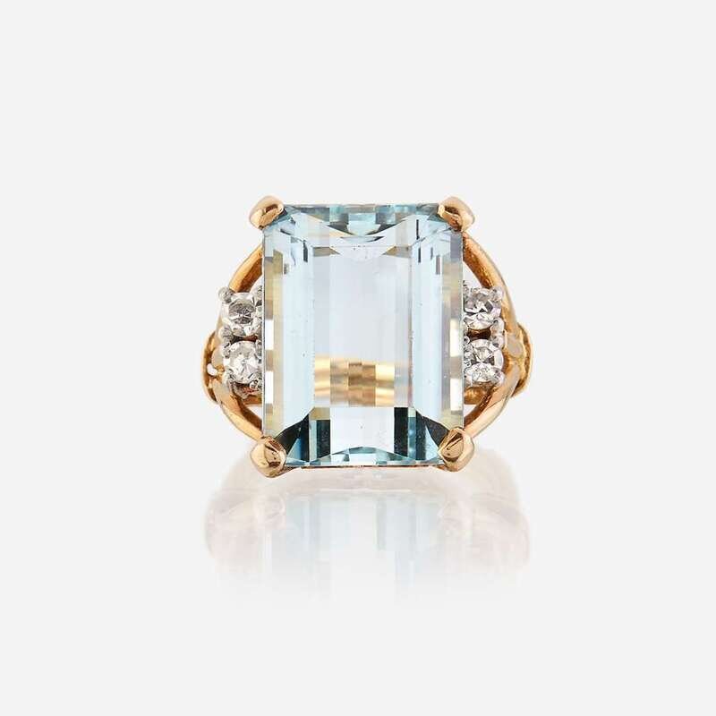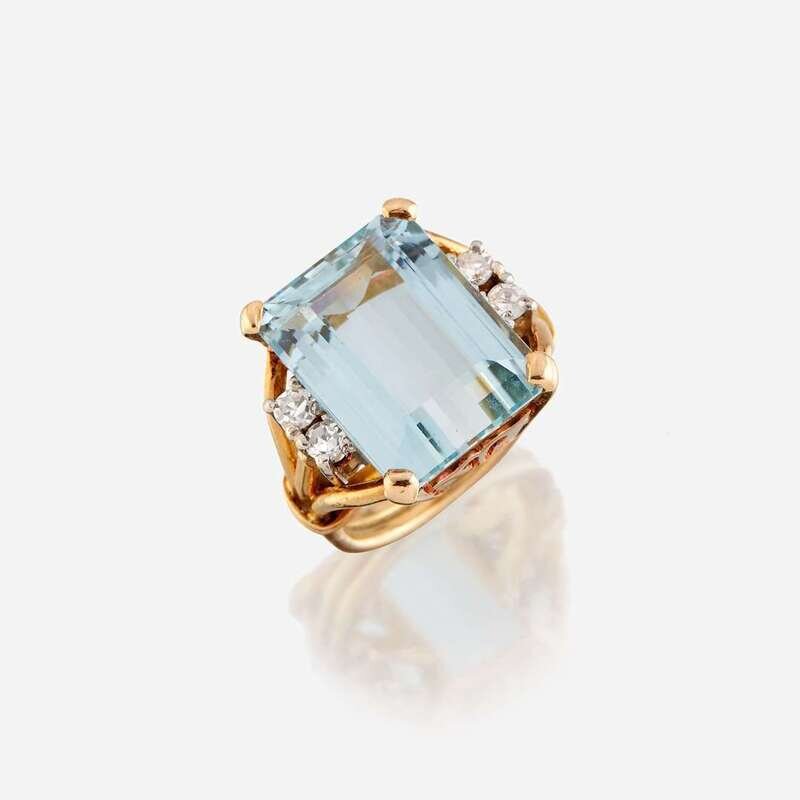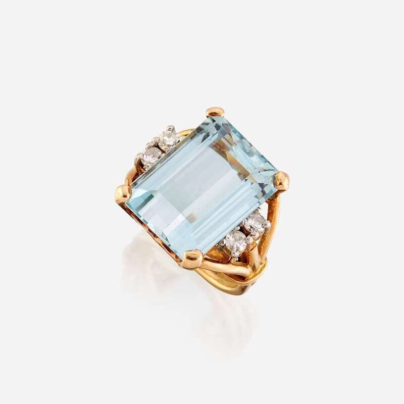 centering an emerald-cut aquamarine weighing approximately 11.00 carats, flanked by single-cut diamonds.